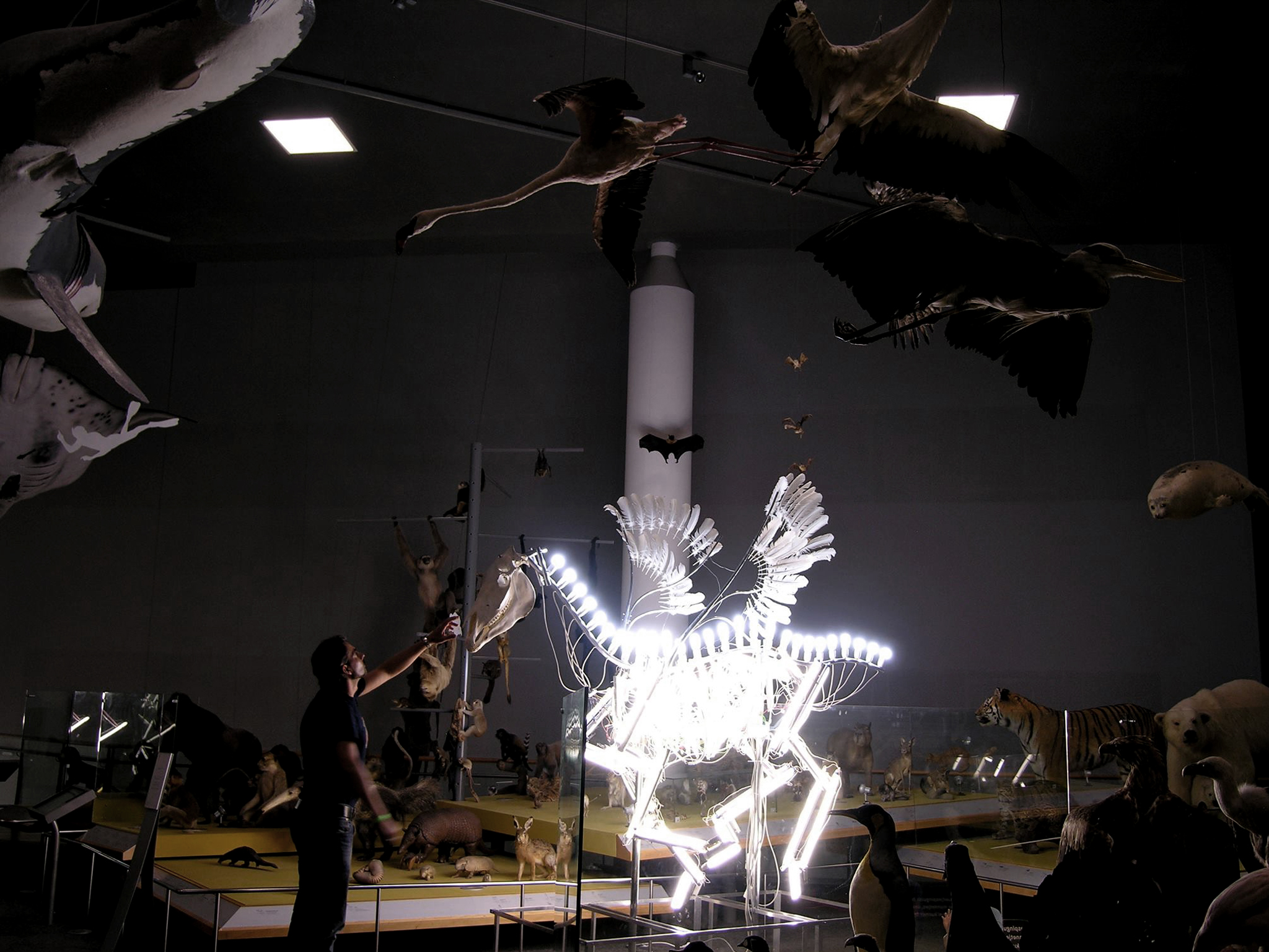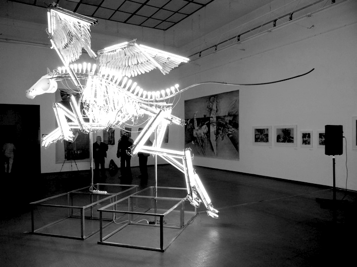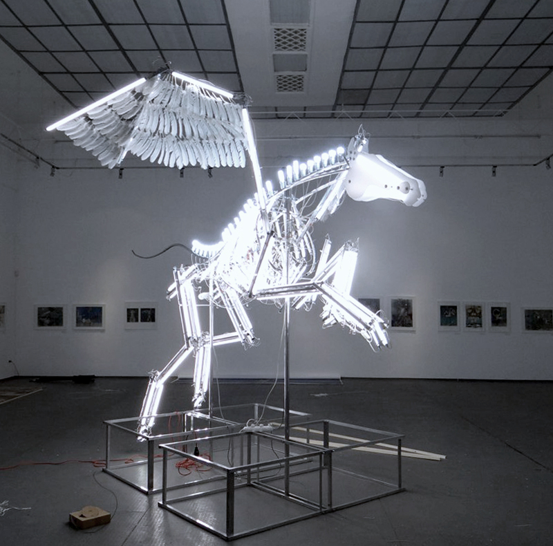 The installation represents the skeleton of a horse, where light tubes and lights of different shapes and sizes replace the bones structure. Wires and cables become nerves and veins in this odd anatomy model.